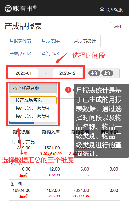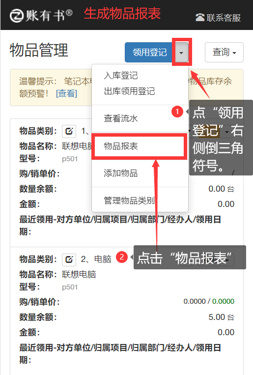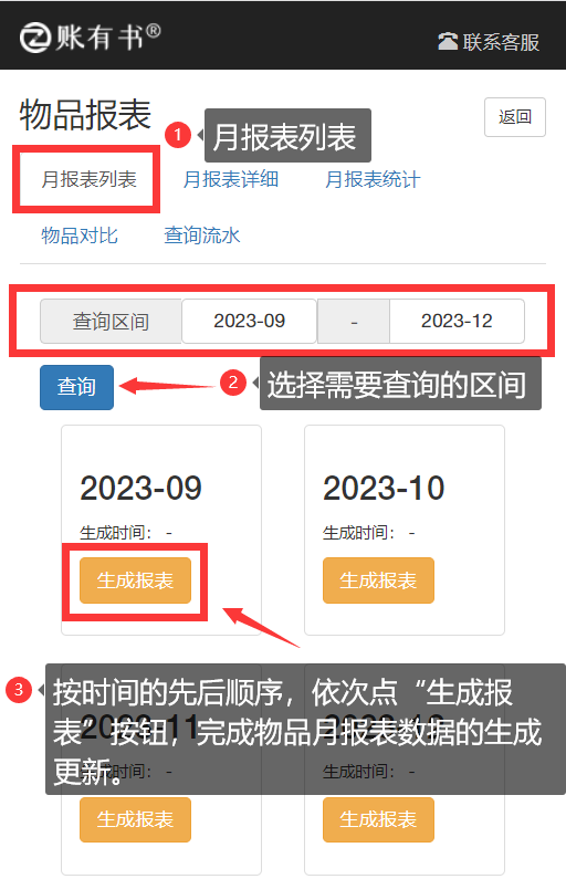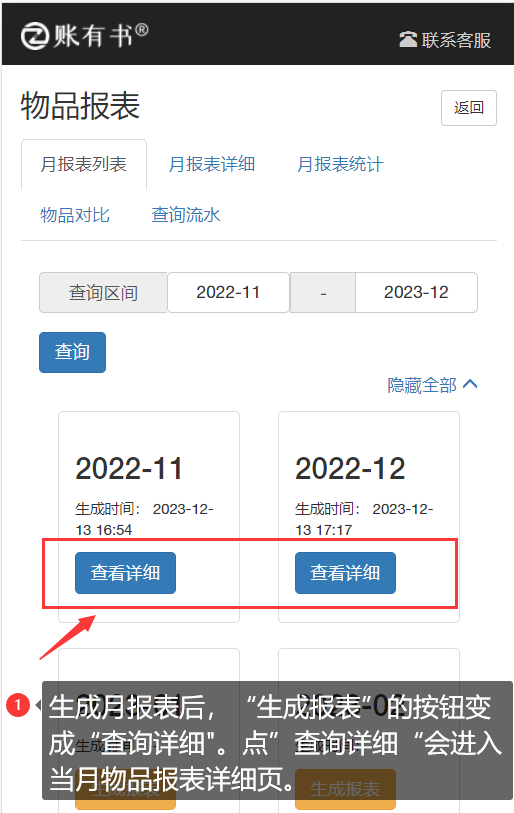 一、生成物品月報表 用戶進入“物品管理”菜單,點擊“物品報表”按鈕進入月報表列表頁面,月報表頁面列出了最近12個月的報表,也可通過設置查詢區間,定位需要查詢的時間段。每個月的月報表下方對應了一個“生成報表”按鈕,點“生成報表”按鈕即可生成當月的月報表詳細。 注意:生成月報表時,需按照時間的先后順序依次生成,以保證數據是逐月累計下來,有連續性和準確性。