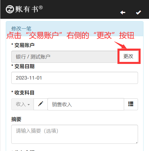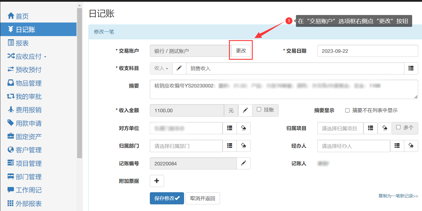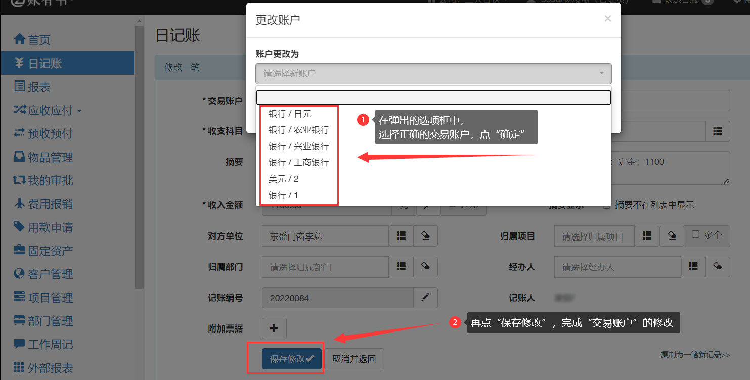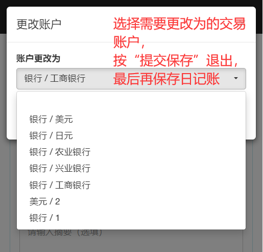 日記賬交易賬戶錄錯,僅需重新修改當筆日記賬,選擇正確的交易賬戶,再點保存即可。(如下圖)