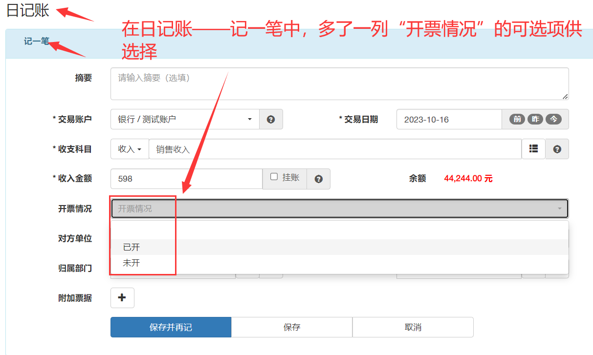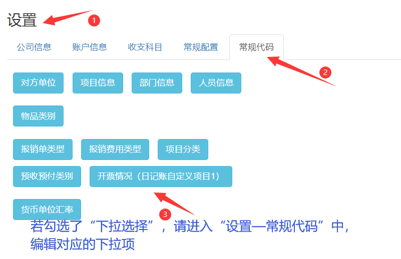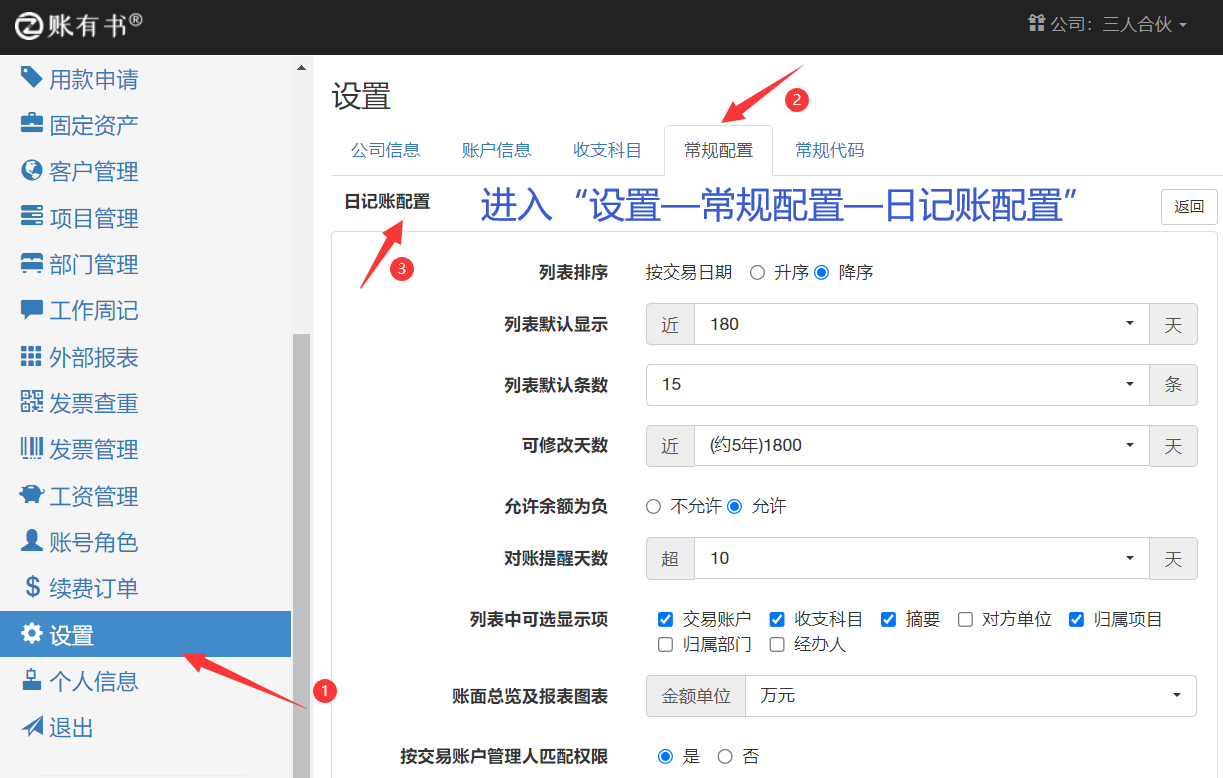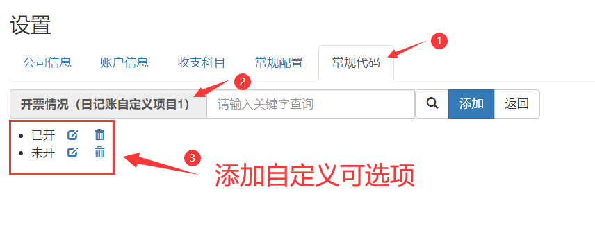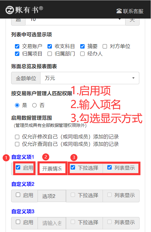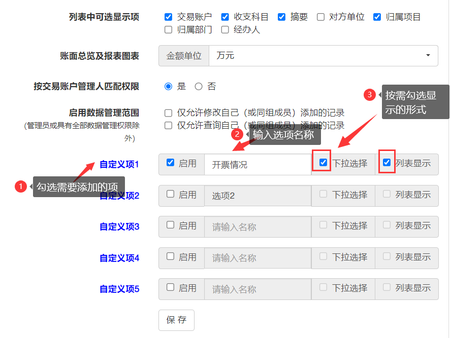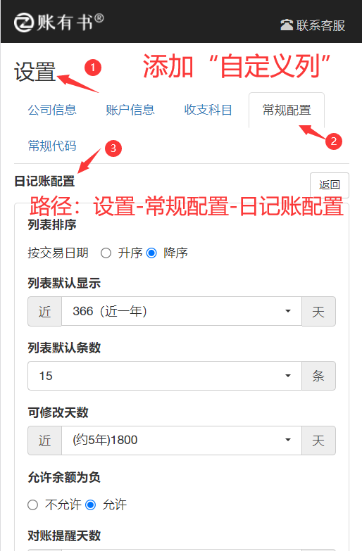 用戶可以根據自己的需要,在日記賬中多增加展示列。用戶可以通過在“設置-常規配置-日記賬配置”中,啟用自定義項來添加自定義列。