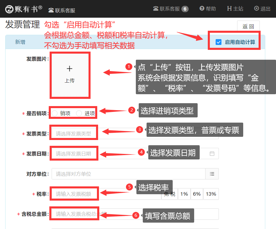 通過發票管理的“新增”按鈕,進入發票新增添加頁面。上傳發票圖片,可以自動識別發票號碼、發票代碼、發票總額、稅額和稅率等信息。由于發票格式不同,可能會出現部分無法識別或者只能識別部分信息的情況,可手動填入其余未識別的信息。可通過“啟用自動計算”根據已填入的信息自動計算其他數值項。