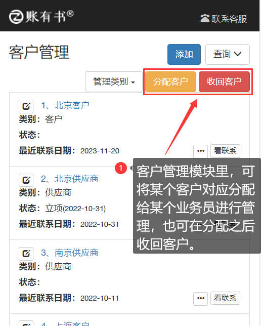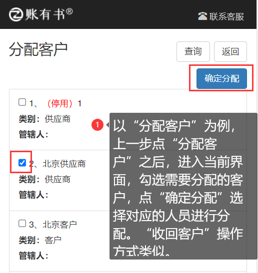 分配客戶管轄權限,可以將某個客戶分配給對應的人員進行維護管理,被分配客戶的人員可以實現僅能管理或修改自己客戶的效果。