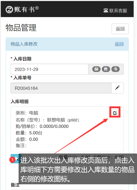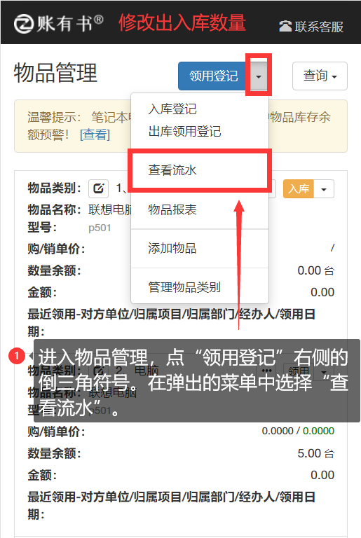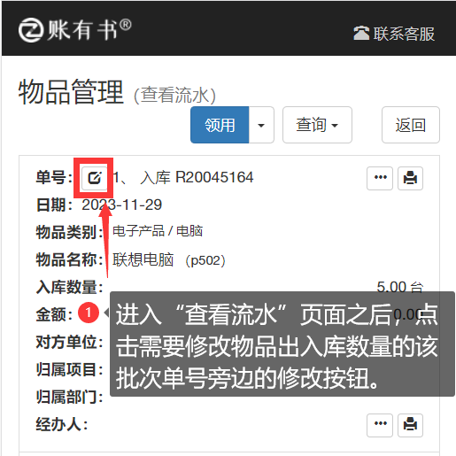 修改出入庫數量 操作步驟: 1、進入“賬有書”的物品管理“菜單,點”查看流水“。 2、點出入庫單號旁邊的修改按鈕。 3、找到需要修改出庫或入庫數量的物品,點左側的修改按鈕。 4、在彈出的編輯窗口直接修改物品的數量,點擊”確定“完成修改。