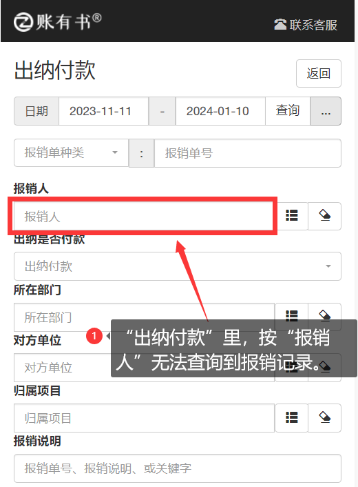 二、“出納付款”中的查詢條件,包括日期區間、出納是否付款的選項是否匹配了報銷單的報銷時間和付款狀態。
