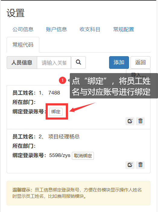 解決此問題需前往“設置-常規代碼-人員信息”里,將員工姓名與賬號進行綁定,綁定之后原有的報銷單重新保存之后,即可通過報銷人查詢到報銷單。